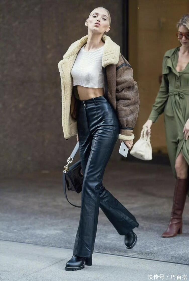 除了以上提到的材质外,皮质微喇裤上身成果也不赖,中性飒爽的皮质材质和圭表氛围的神态磋磨,秒变气质女神,气场全齐。搭配防水台高跟及踝靴大概尖头及踝靴成果齐不赖。