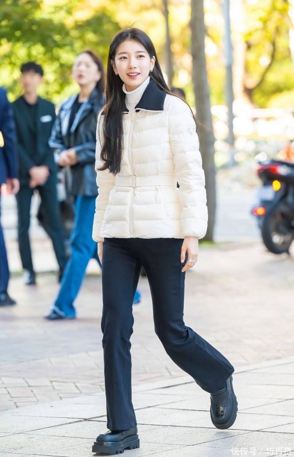 对腿长姐妹来说,九分微喇裤上身干净利索,但对腿短尤其体格五五分的姐妹来说,可以优先谈判拖地微喇裤应用腿长蔓延腿长,搭配及臀大概不外臀羽绒服秒变三七分超模体格。